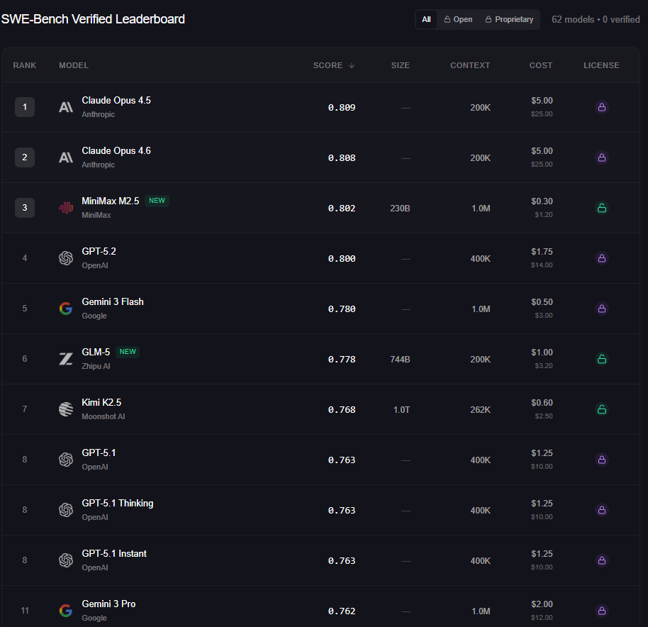 目前(2026年2月13日),MiniMax M2.5居第三位,GLM-5居第六位,Kimi K2.5居第七位。如图: